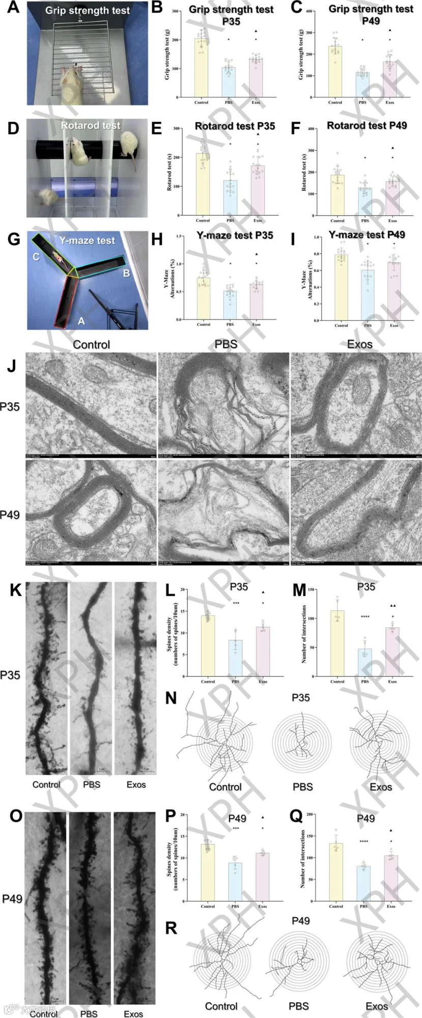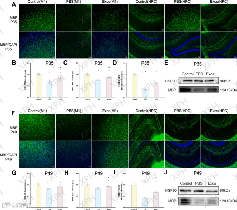 基于此模型,研究团队将BCAO大鼠随机分配至hUCMSC-Exos治疗组与PBS对照组。自P21天起,治疗组每隔3天经尾静脉注射一次hUCMSC-Exos(剂量为1×10⁹颗粒/次,共4次,给药间隔由活体成像实验优化确定)。在P35和P49天进行的多维度评估结果显示,与对照组相比,hUCMSC-Exos治疗组大鼠在转棒实验中的停留时间显著延长、前肢抓力明显增强(运动功能改善),且在Y迷宫实验中的自主交替率显著提高(认知能力提升)。研究进一步表明,hUCMSC-Exos的治疗效应源于其多靶点协同作用:它显著促进了髓鞘相关蛋白(MBP、Olig2)的表达以修复髓鞘损伤;有效降低了小胶质细胞标志物(Iba-1)及炎性因子(TNF-α、IL-6)的水平以抑制神经炎症;同时上调了脑源性神经营养因子(BDNF)的表达以强化神经营养支持。重要的是,这些积极效应在治疗结束后仍持续存在,提示其疗效具有持久性。