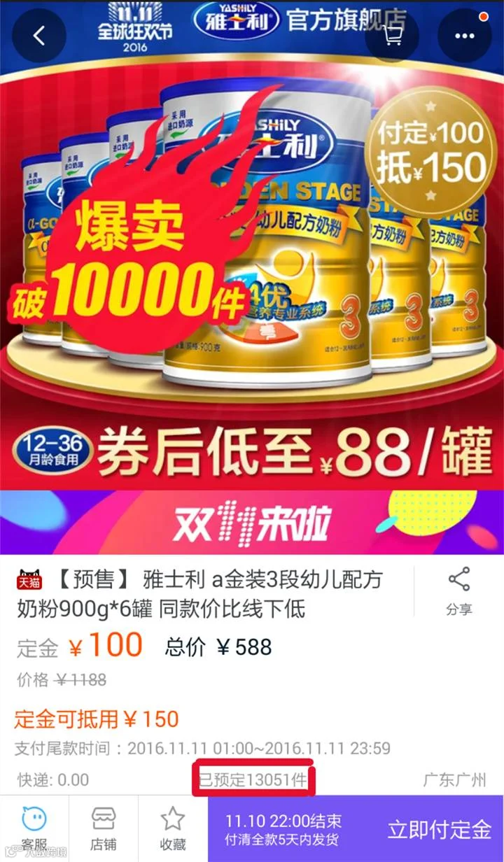 10月21日,天猫双十一大战提前引爆,各路品牌都强势出击,撕杀激烈。奶粉行业中,去年双十一的销售冠军雅士利再次发力,一举拔下第一个“作战日”的头筹,截止21日下午4点,雅士利主推产品——金装预订突破10000件,占领行业首位。当日销量突破12000件,稳坐双十一首轮预售奶粉冠军位置,领军国产奶粉成功打响2016年双十一促销战第一炮。