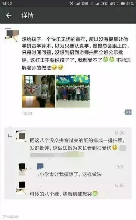 其中一张照片上是8个小朋友因没有接受提前早教,数学和拼音跟不上,被惩罚站成一排“示众”。另一张图片是一个小朋友拿着手抄报在展示,因为孩子亲手制作的手抄报远远比不上那些在家长帮助下制作的水平。