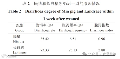 民猪和长白猪断奶后一周的腹泻率、腹泻频率和腹泻指数见表2。试验结果表明,长白的腹泻率、腹泻频率和腹泻指数均高于民猪。总体来说,民猪断奶后抵抗腹泻的能力优于长白猪。