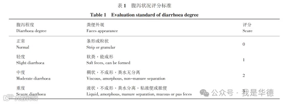 随机挑选健康民猪48头和长白猪60头于35日龄断奶,每日早9:00和傍晚16:00逐头观察仔猪的粪便及肛门,参照舒邓群的方法,根据粪便的外观(条粒状或稀稠状)及肛门是否红肿或有粪便污染,对仔猪腹泻程度进行评分(评分标准见表1),计算腹泻率、腹泻频率和腹泻指数反映仔猪的腹泻程度。