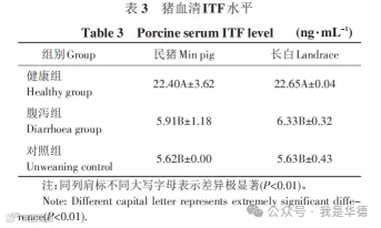 民猪和长白猪各组仔猪血清ITF水平检测结果见表3。断奶后民猪和长白的血清ITF水平健康组极显著高于未断奶对照组和腹泻组(P<0.01),而腹泻组与对照组的ITF水平没有显著差别。