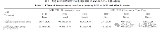 试验结果表明,与对照组相比,在饲料中添加表达EGF酿酒酵母对中华绒螯蟹对照组和试验组血清溶菌酶含量分别为44.44和66.67 U/mL。EGF能够显著提高其免疫能力。由表2可看出,与对照组相比,各组织中SOD和MDA的含量影响不显著(P > 0.05)。说明EGF对中华绒螯蟹的肝脏保护作用不明显,但同时另一个角度也说明EGF对中华绒螯蟹的肝脏不会造成损伤,具有安全性。