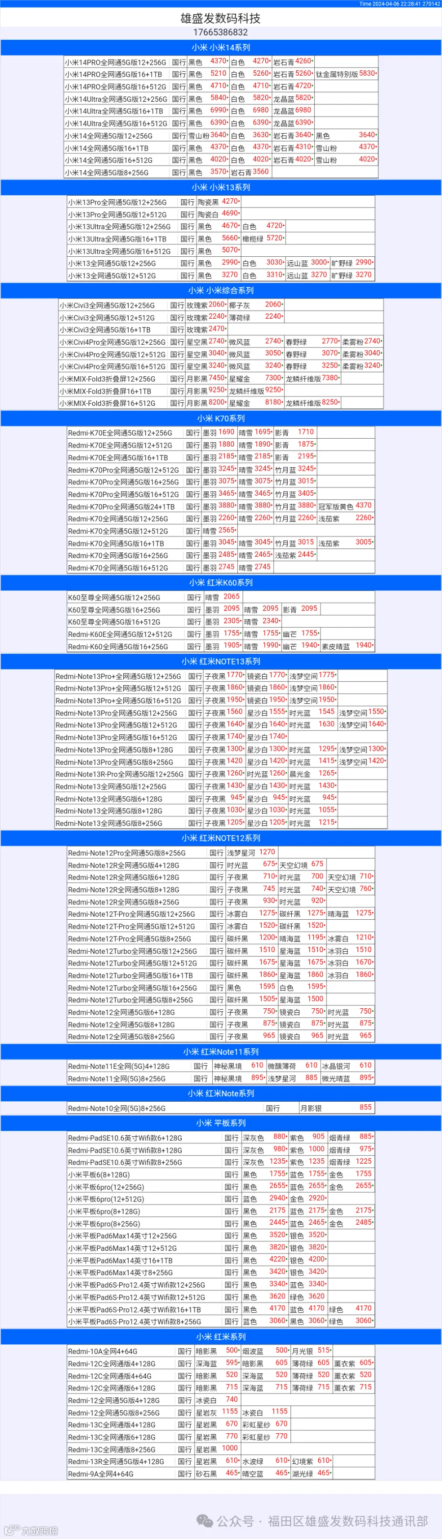 新机报价【2024年4月6日】小米  红米   黑鲨   报价 芯烨微 电子科技