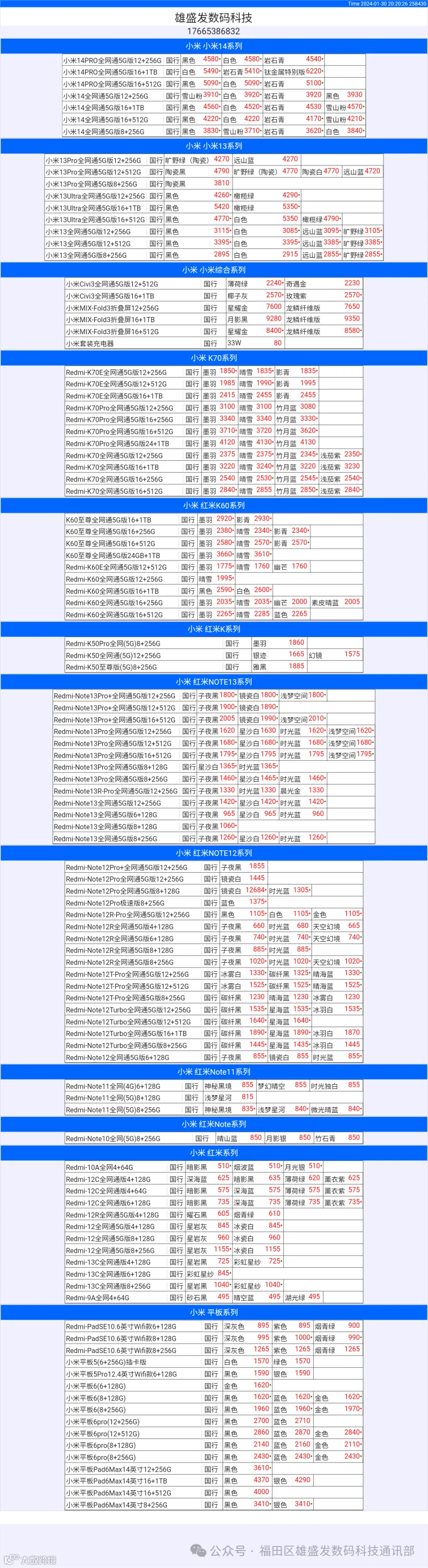 新机报价【2024年1月30日】小米  红米   黑鲨   报价 芯烨微 电子科技