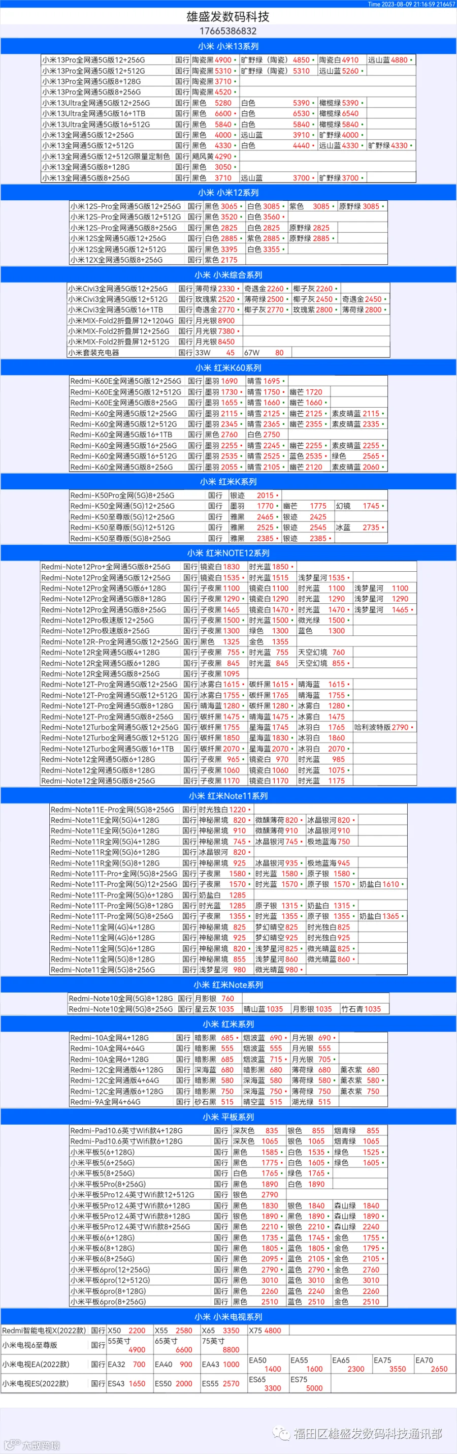 新机报价【2023年8月9日】小米  红米   黑鲨   报价 芯烨微 电子科技