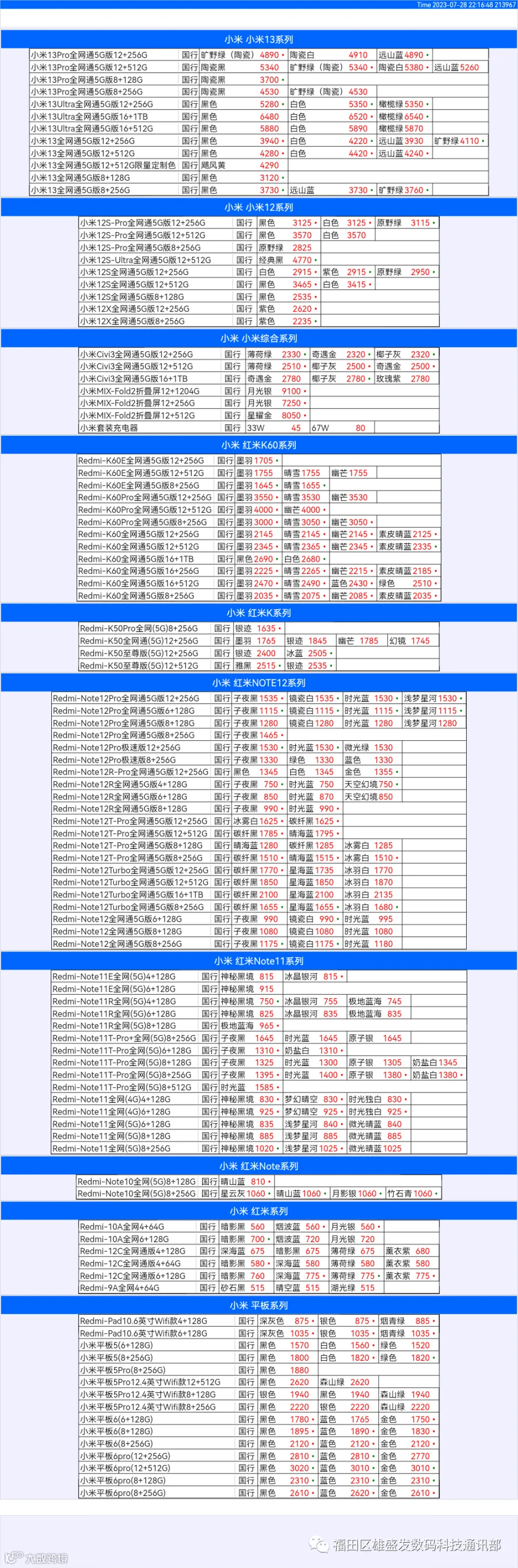 新机报价【2023年7月28日】小米  红米   黑鲨   报价 芯烨微 电子科技