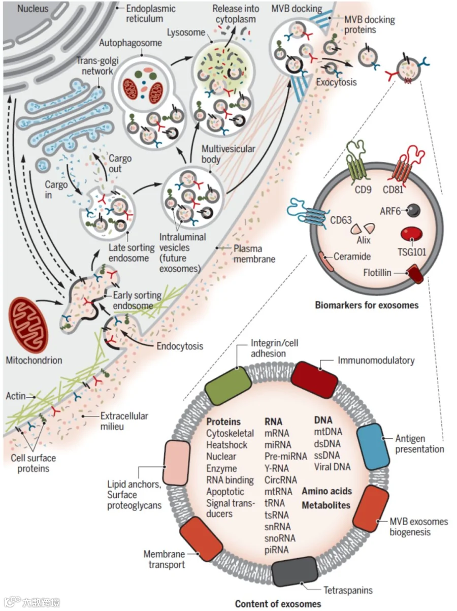 同时,外泌体不仅在细胞间通讯中起作用,还参与生物活性分子的转运、免疫应答、蛋白质质量调节等生理功能。它们在多种生理和病理条件下都能发挥作用,显示了广泛的研究和应用潜力。