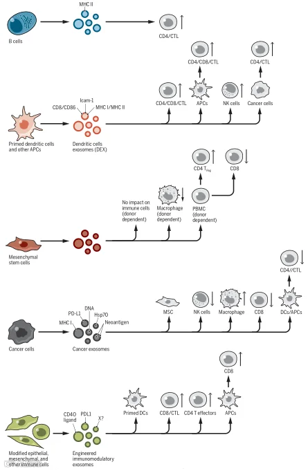 外泌体的来源多样,因此作用也各有所异。其包括但不限于以下几种细胞类型和体液: