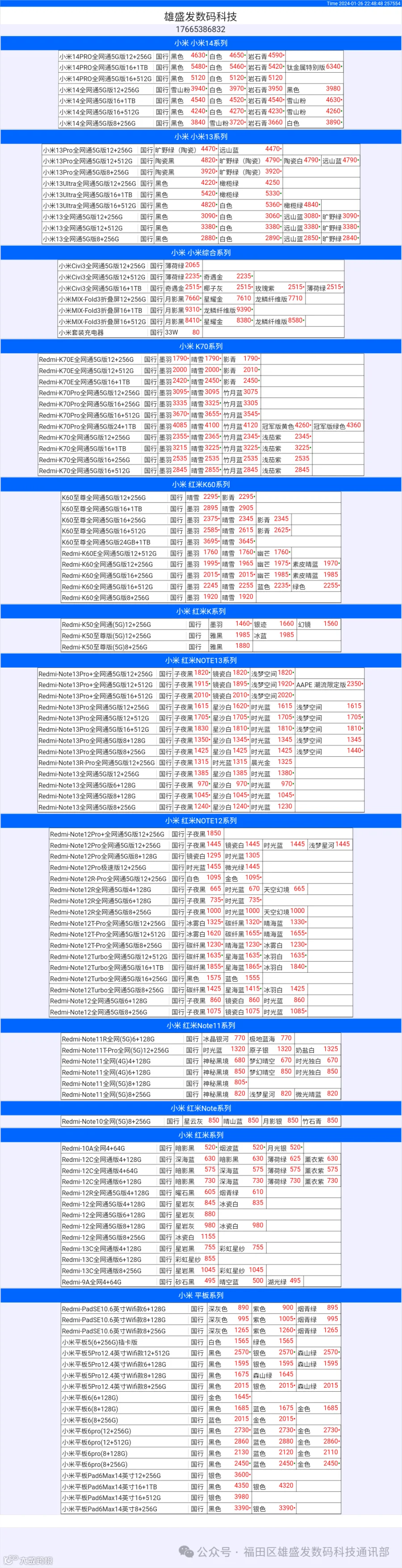 新机报价【2024年1月26日】小米  红米   黑鲨   报价 芯烨微 电子科技