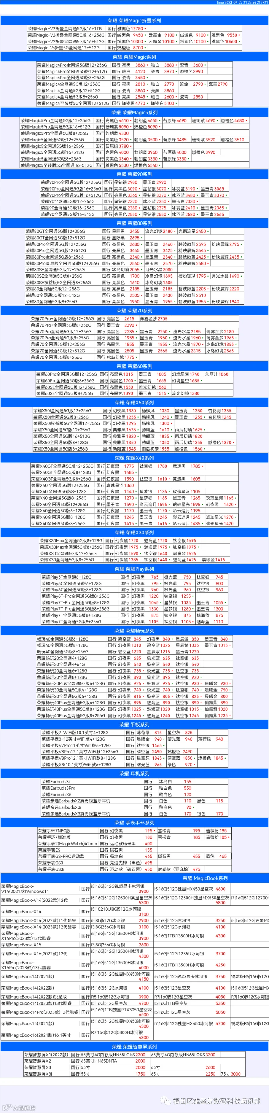 新机报价【2023年7月27日】华为 荣耀 报价