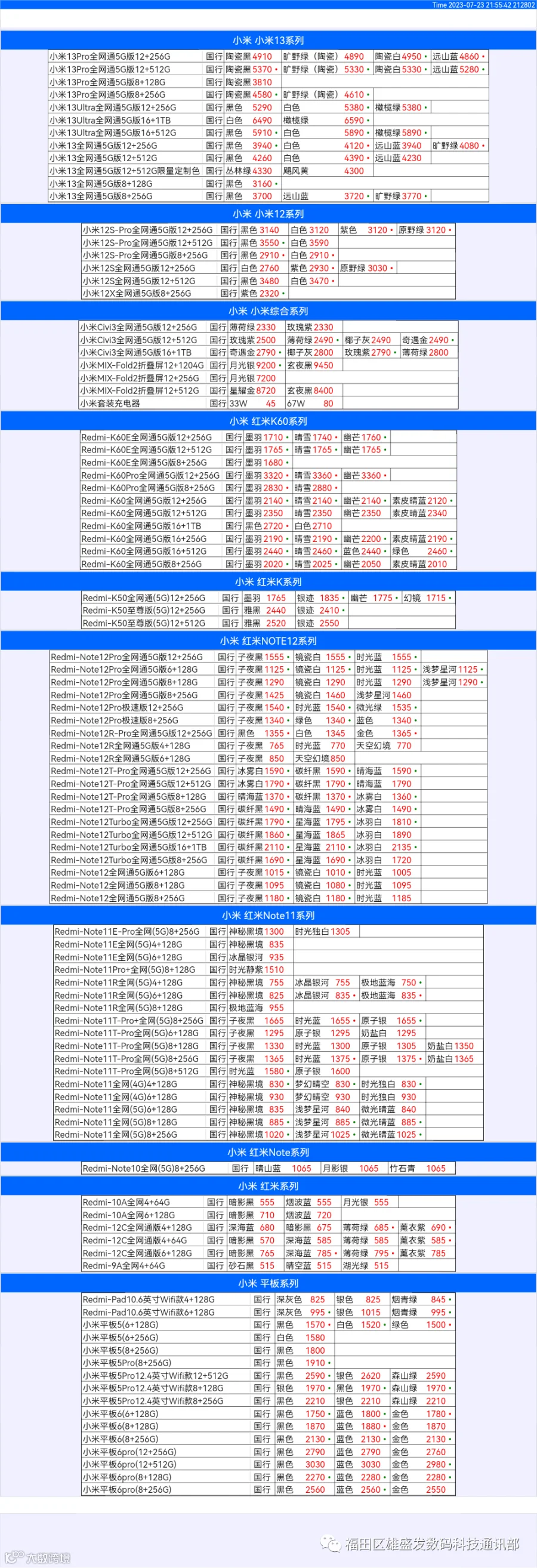 新机报价【2023年7月23日】小米  红米   黑鲨   报价 芯烨微 电子科技