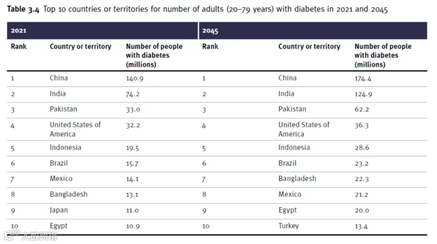 2021年和2045年成人糖尿病患者人数排名前10位的国家或地区