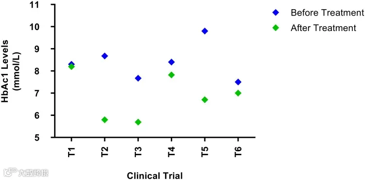 间充质干细胞(MSC)治疗前后的HbAc1水平,所有研究均有下降
