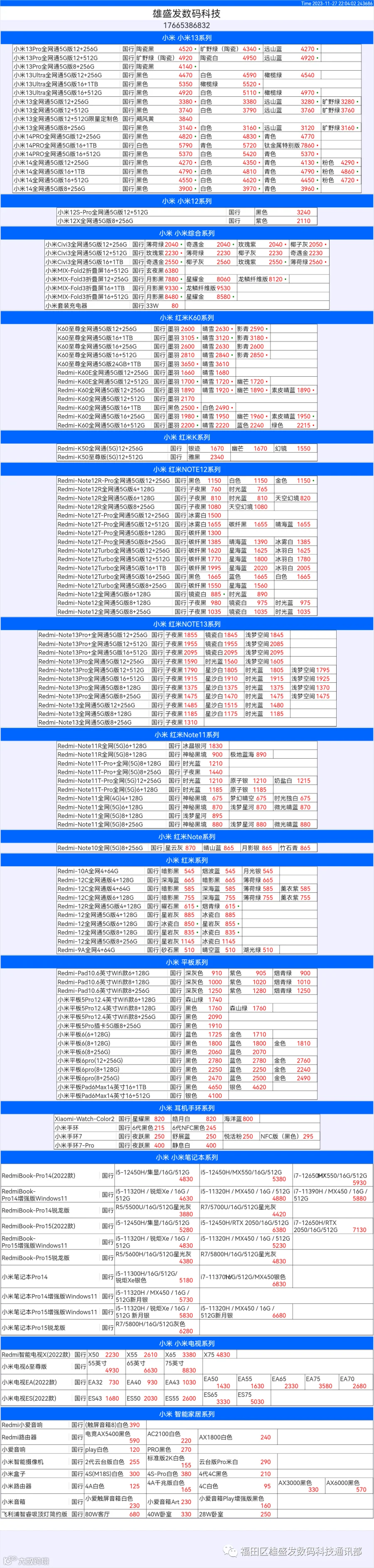 新机报价【2023年11月30日】小米  红米   黑鲨   报价 芯烨微 电子科技