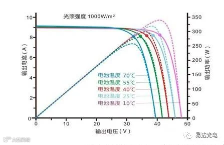 由此可以看到组件的温度对其功率的输出影响较大,所以阵列要安装在通风、无遮挡的地方,以保持凉爽;