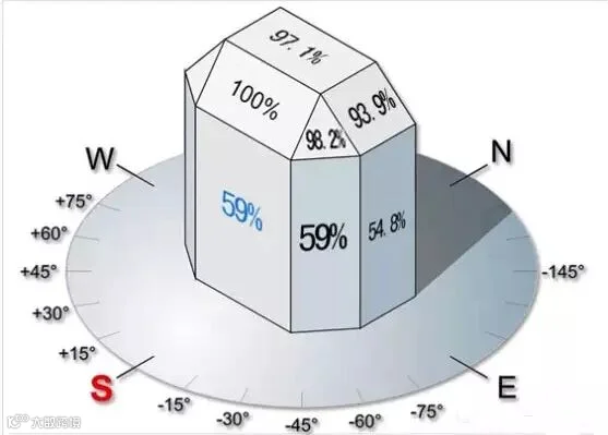 即使屋顶不朝南,也是可以安装的,但是发电量稍微少一点,根据屋顶的方向发电量是有变化的。朝南的话是100%,朝东西的话可能在70-95%之间,朝北的话是50-70%之间。