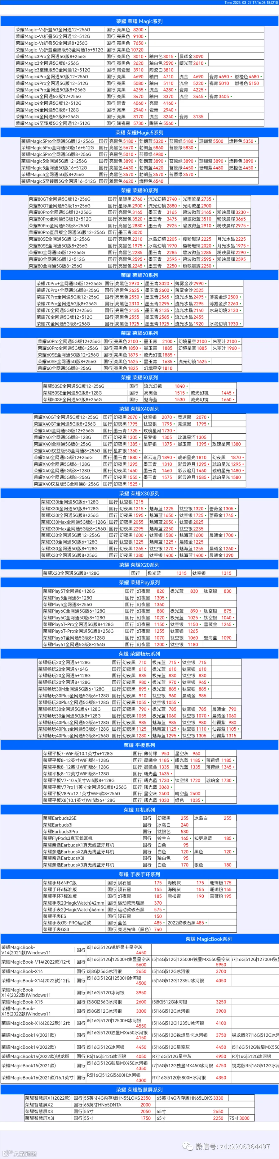 新机报价【2023年3月27日】华为 荣耀 报价