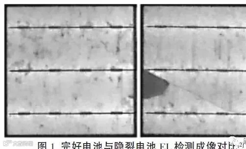 隐裂是一种无法通过肉眼直接发现的组件破损缺陷现象。目前较常用的检测方法有EL成像、强光或沾酒精透过裂纹观测。其中EL检测仪利用晶体硅的电致发光原理检测出隐裂等电池片内部缺陷,是一种较为准确的方式。