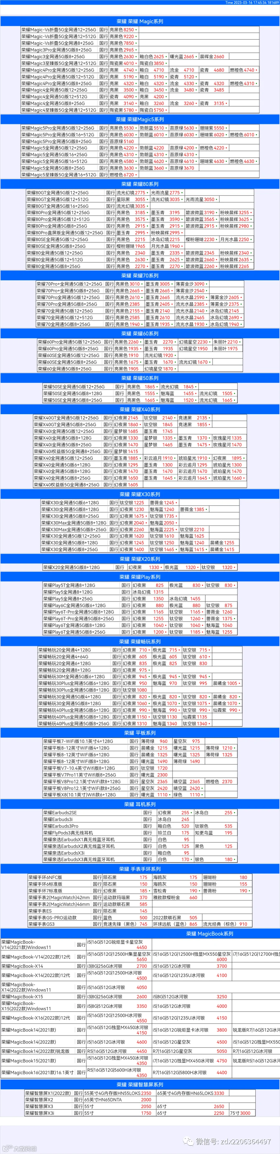 新机报价【2023年3月16日】华为 荣耀 报价