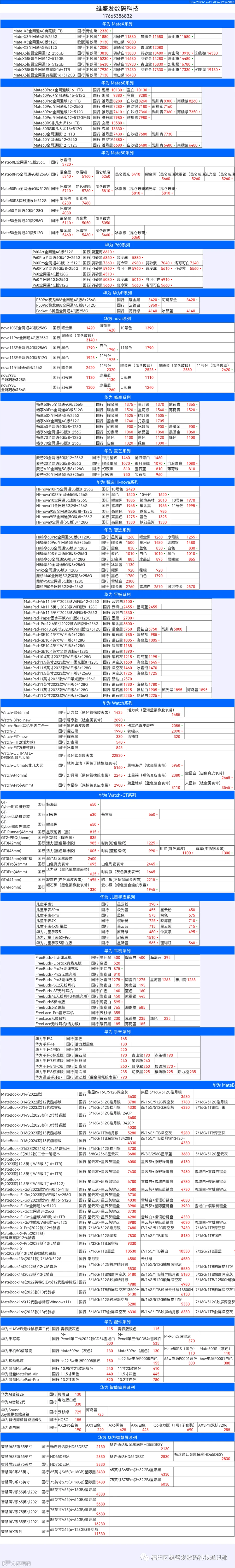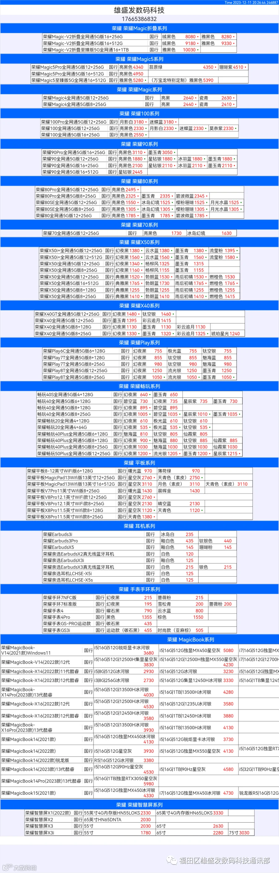 新机报价【2023年12月11日】华为   荣耀 报价 芯烨微 电子科技