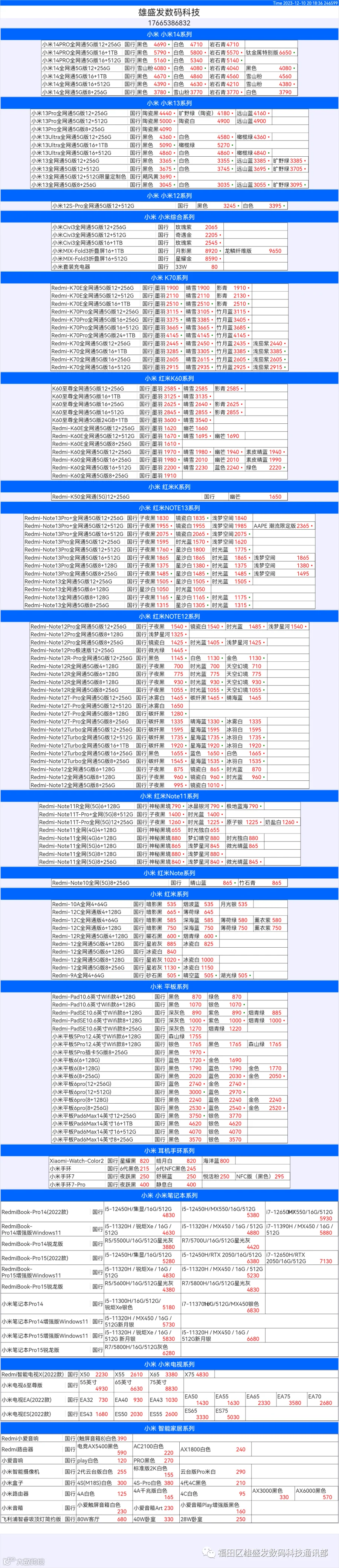 新机报价【2023年12月10日】小米  红米   黑鲨   报价 芯烨微 电子科技