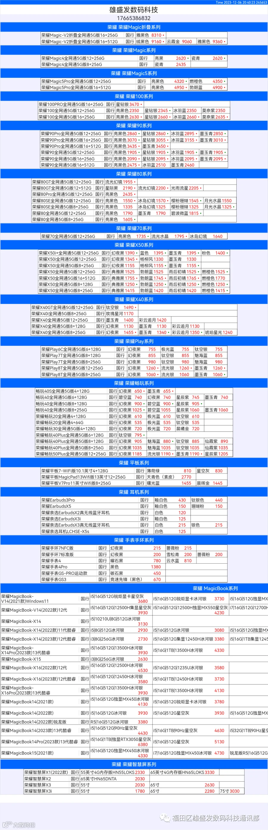 新机报价【2023年12月6日】华为   荣耀 报价 芯烨微 电子科技