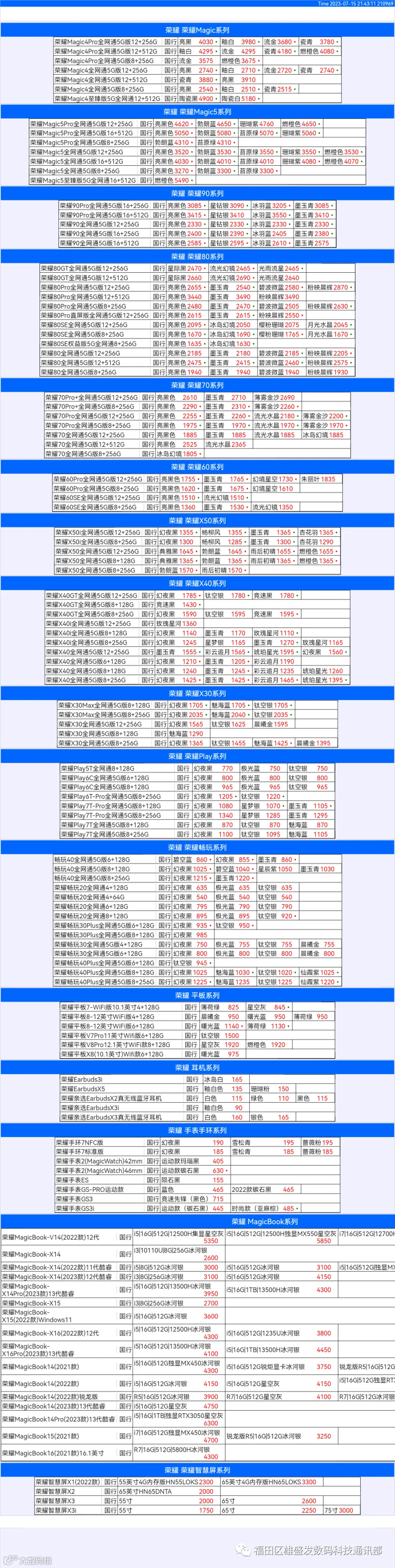 新机报价【2023年7月15日】华为   荣耀 报价 芯烨微 电子科技
