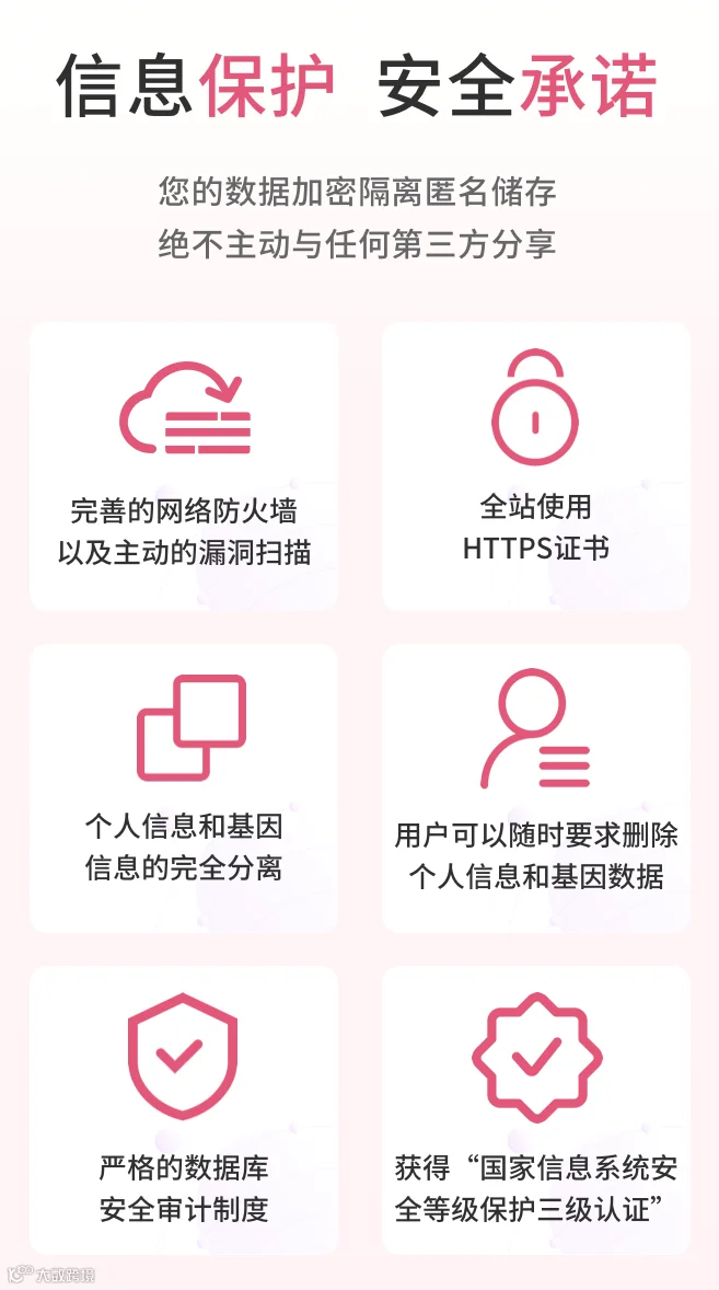 我们承诺:在保障每一位用户数据安全的同时,为大家提供专业的基因检测服务。