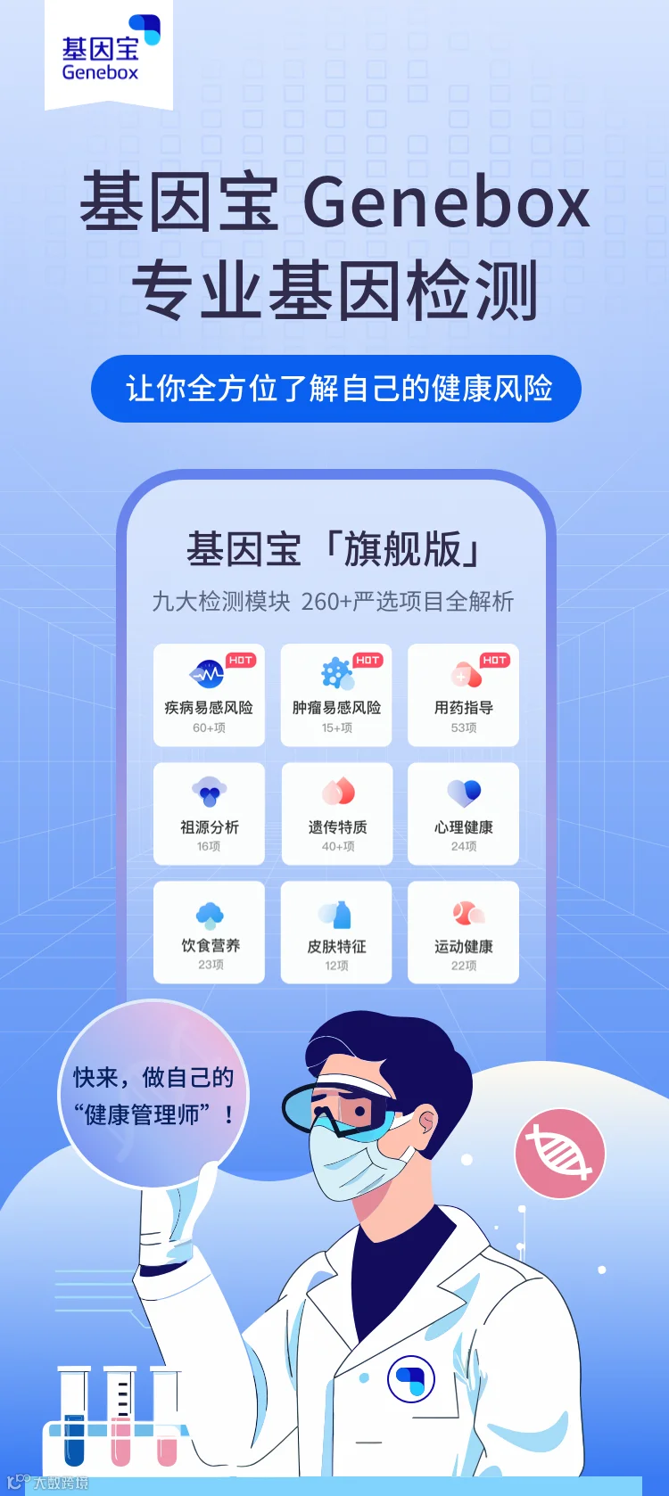 包含疾病易感风险、肿瘤易感风险、用药指导、祖源分析、遗传特质、心理健康、饮食营养、皮肤特征、运动健康9大板块,共260+项目全解析,每个人都可以做自己的“健康管理师”。
