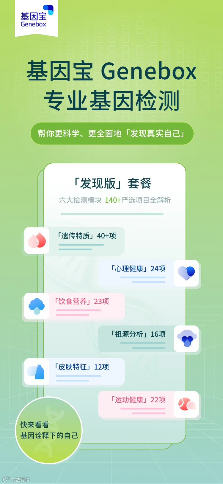 包含遗传特质、心理健康、饮食营养、祖源分析、皮肤特征、运动健康6大板块,共140+项目检测,帮你更科学、更全面地发现真实自己。