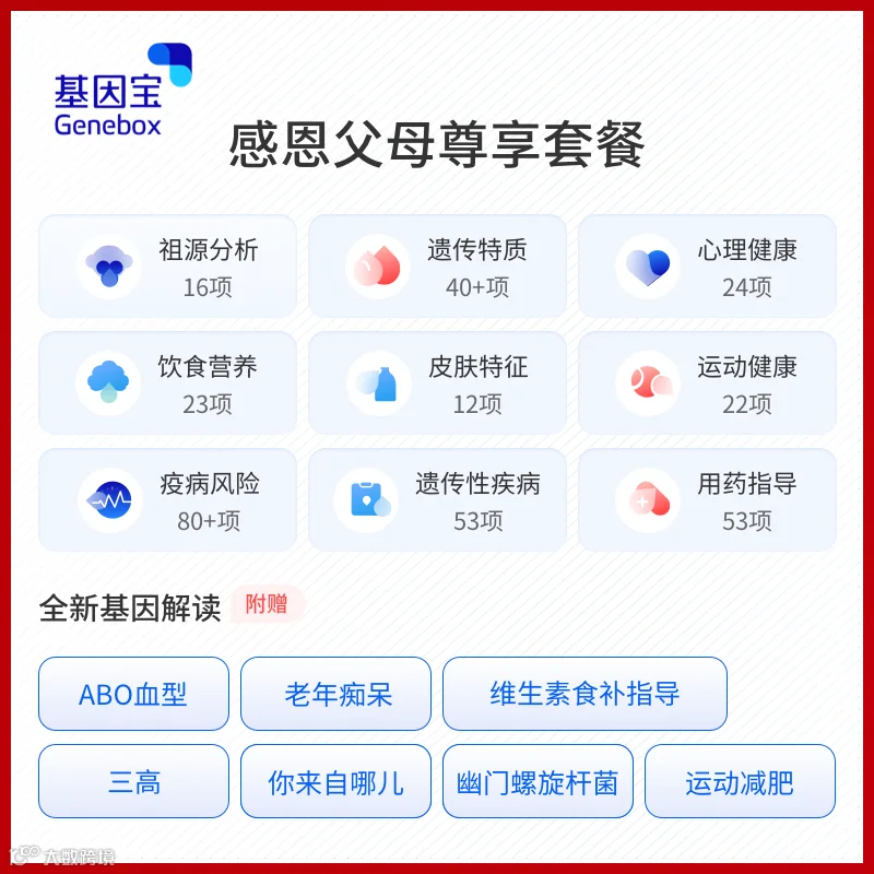 如果父母已经拥有了基因检测产品——去亲戚家也免不了带礼物嘛,给叔叔婶婶、伯父伯母也安排一份呗~