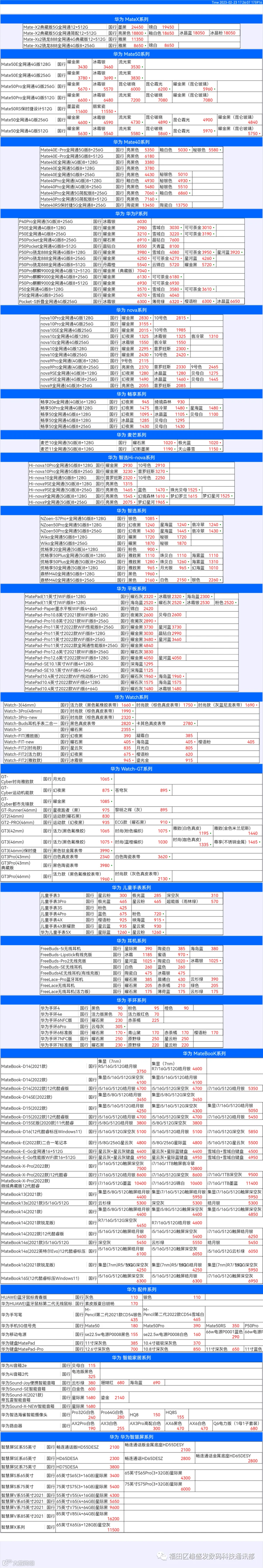 新机报价【2023年2月23日】华为   荣耀 报价 芯烨微 电子科技
