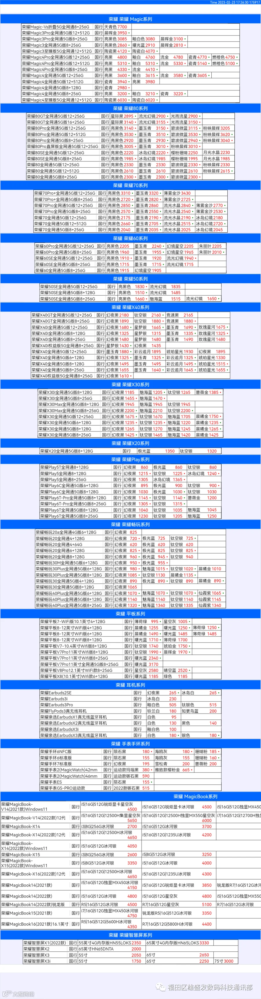 新机报价【2023年2月23日】华为 荣耀 报价