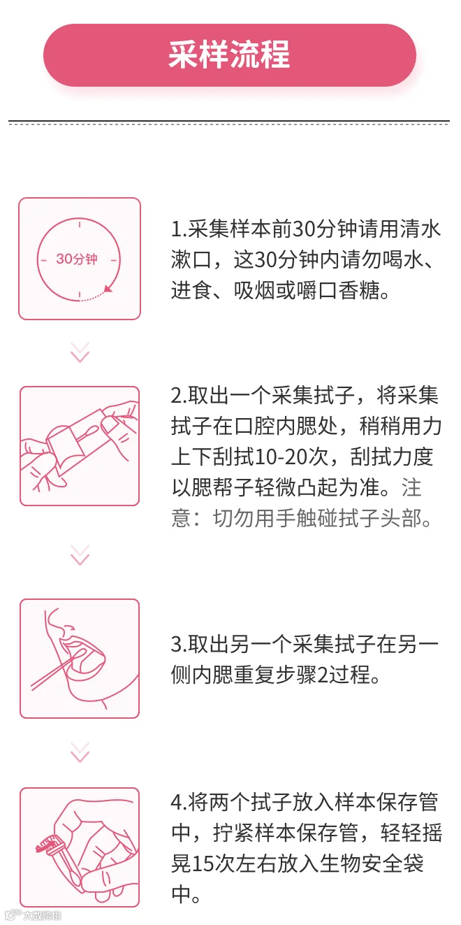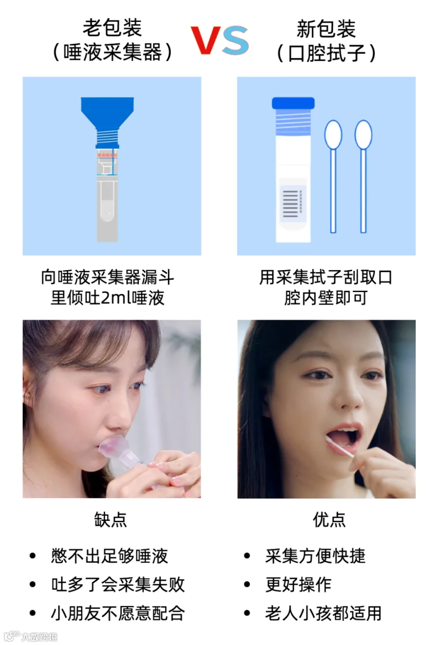 简单来说就是:采集方式更方便了,大家不用再吐口水收集唾液,只需要刮刮口腔壁即可完成采样。