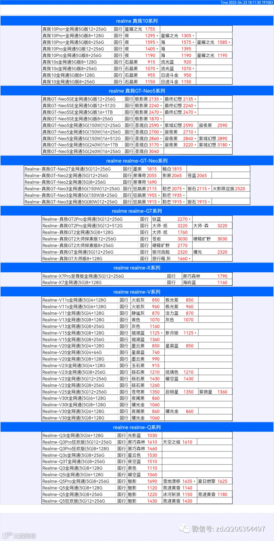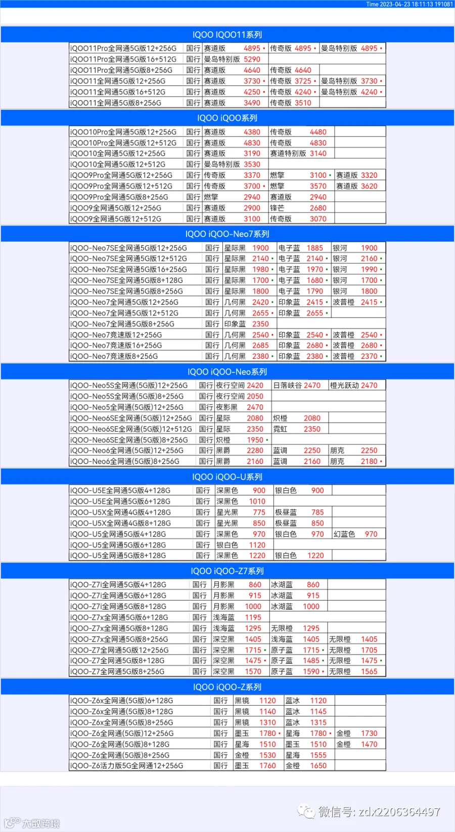 新机报价【2023年4月23日】OPPO VIVO IQOO 一加 真我