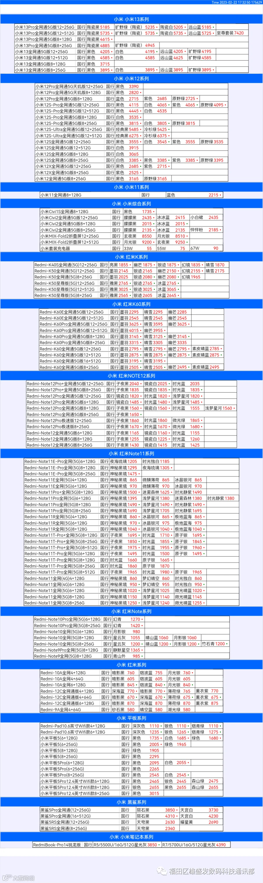 新机报价【2023年2月22日】小米  红米   黑鲨   报价 芯烨微 电子科技