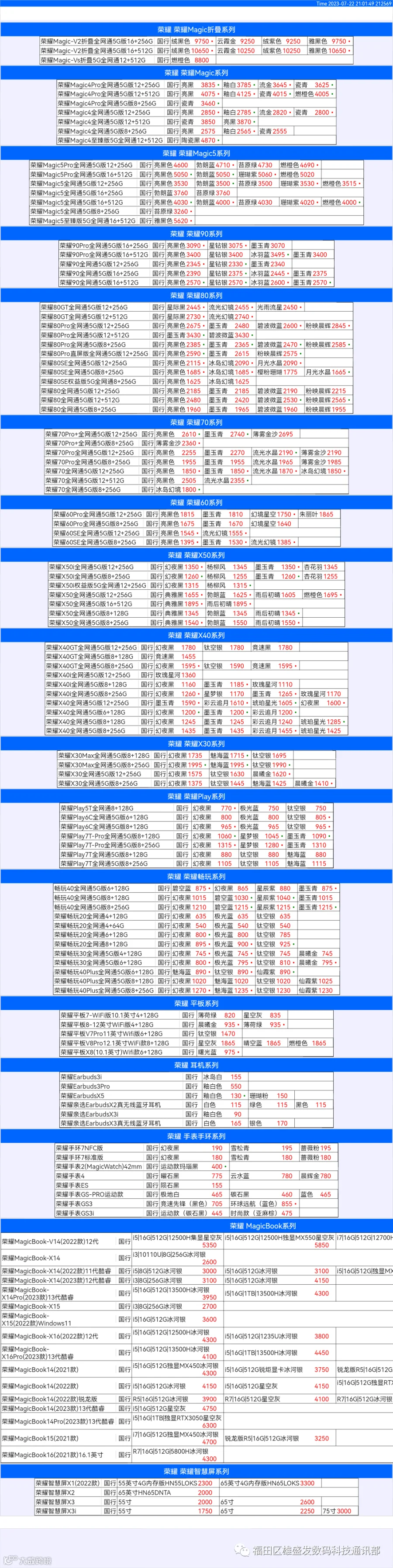 新机报价【2023年7月22日】华为 荣耀 报价