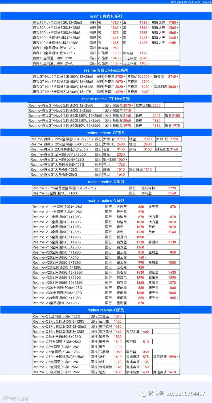 新机报价【2023年3月29日】OPPO VIVO IQOO 一加 真我