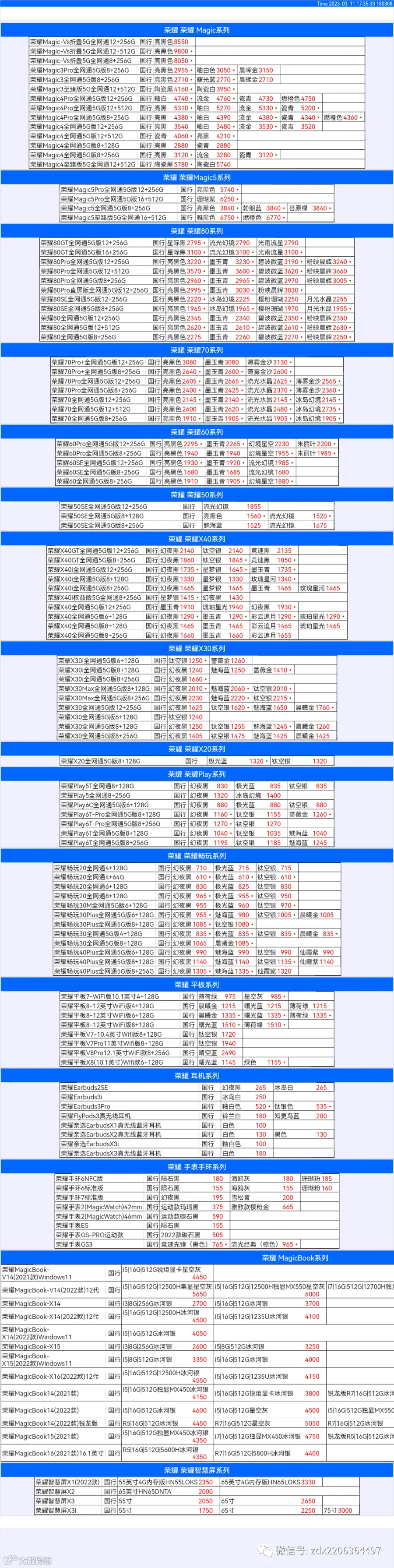 新机报价【2023年3月11日】华为 荣耀 报价