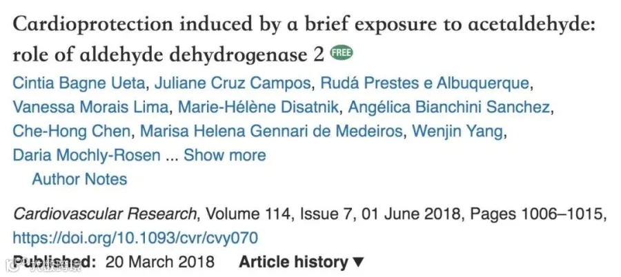 他们发现,适宜的乙醇浓度会激活乙醛脱氢酶,被激活的乙醛脱氢酶不仅可以清除乙醛,还可以清除心肌细胞受损时产生的反应性分子,起到保护性的作用。