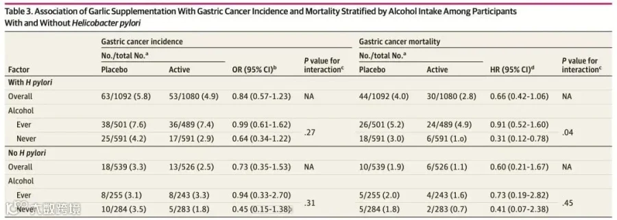 对于有饮酒史的人而言,大蒜补充剂不能降低胃癌导致的死亡风险(HR,0.92),对于没有饮酒史的人而言,大蒜补充剂能显著降低胃癌导致的死亡风险(HR,0.33)。而且这个现象在幽门螺杆菌感染者群体中更显著。