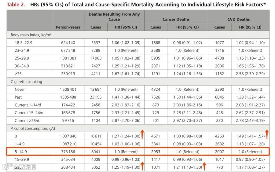 总的来看全因死亡风险,把5-15克/天的酒精摄入量作为参考组,完全不饮酒的人,全因死亡风险增加27%;而每天摄入酒精多于30克的人,全因死亡风险增加25%。