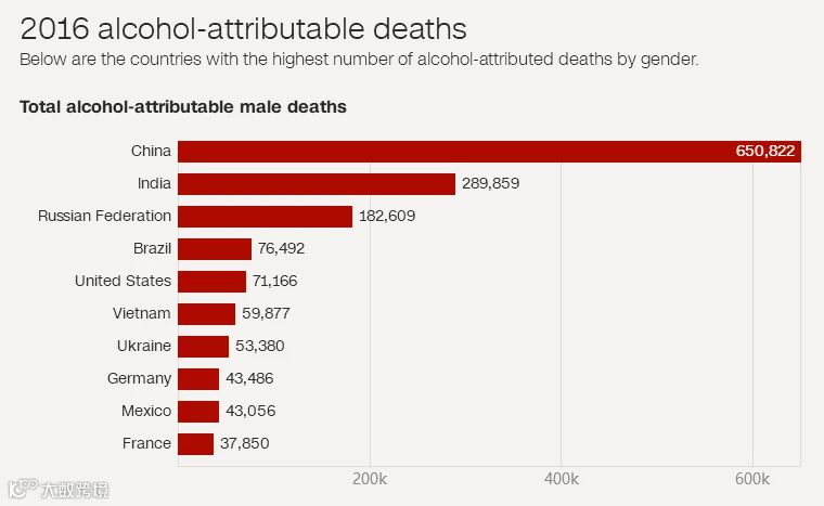 本次研究的结果证明,没有所谓的适量饮酒有益健康一说。除此外,由于人口众多,中国是全球饮酒致死最多的国家,每年有70万国人把命喝没了(65万是男性)!