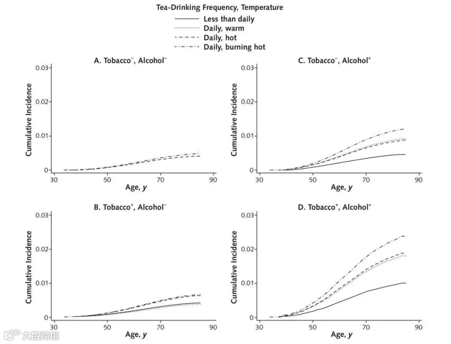 研究结果表明,对于那些没有喝烫茶习惯的人而言,如果同时有抽烟喝酒习惯,他们患食管癌风险是不抽烟喝酒人的2.47倍,但对于那些同时有吸烟、饮酒、喝烫茶习惯的人而言,他们患食管癌的风险,是没有这三个习惯的人的5倍。