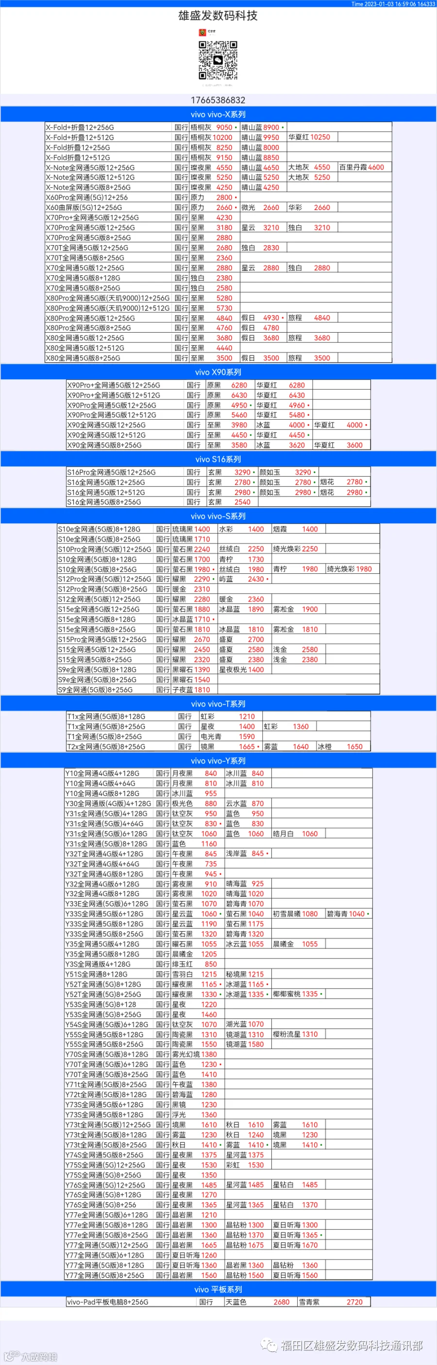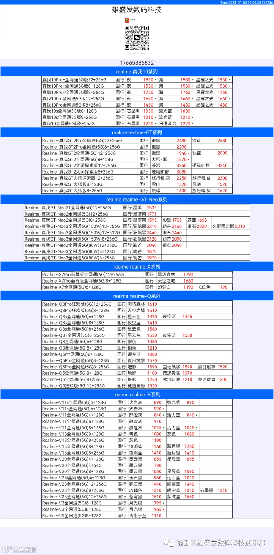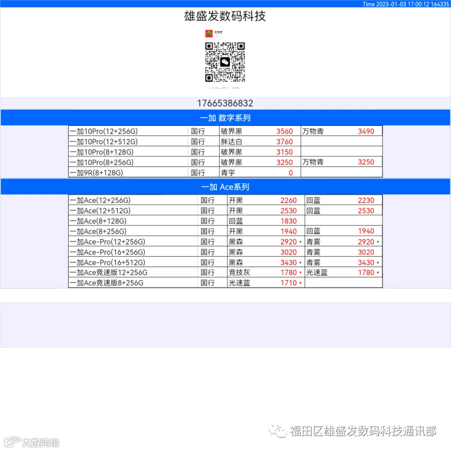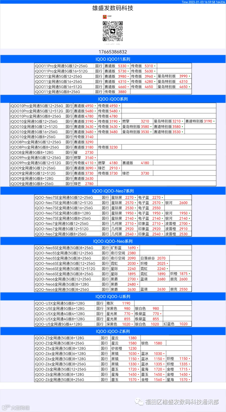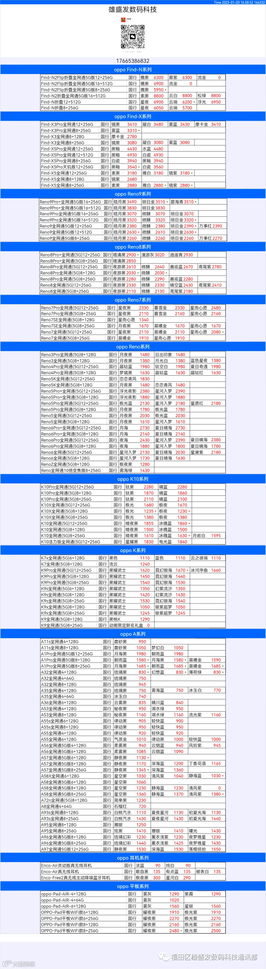 新机报价【2022年1月3日】OPPO   VIVO  IQOO   一加   真我 芯烨微 电子科技