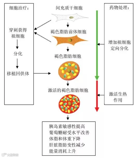 2. 通过体外诱导干细胞分化成褐色脂肪组织细胞,然后移植入肥胖症患者体内。