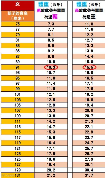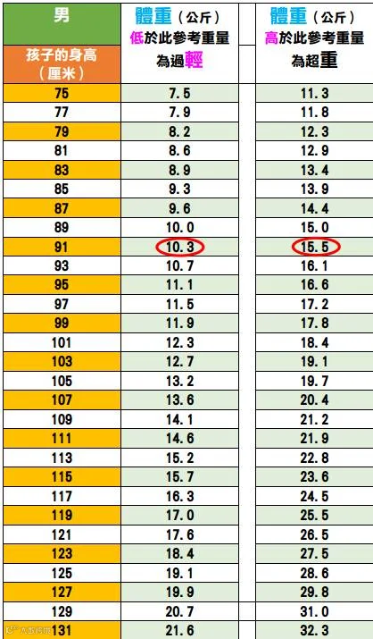 对照方法为:首先从“孩子的身高”栏里找出91cm,从91cm一行得知孩子体重低于10.3kg为过轻,超过15.5公斤为过重。宝宝实际体重13.5kg,则他的体重属正常。