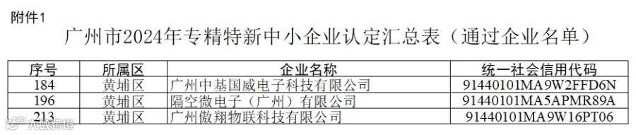 芯大厦园区企业广州中基国威电子科技有限公司、隔空微电子(广州)有限公司、广州傲翔物联科技有限公司3家单位成功入选《广州市2024年专精特新中小企业认定》名单。