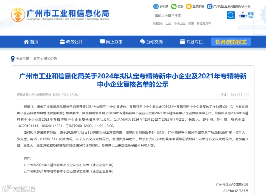 根据《广州市工业和信息化局关于组织开展2024年创新型中小企业评价、专精特新中小企业认定和2021年专精特新中小企业复核工作的通知》《广东省优质中小企业梯度培育管理实施细则》相关要求,广州市工业和信息化局按要求开展了2024年专精特新中小企业认定和2021年专精特新中小企业复核评审工作,并于2024年12月26日将2024年专精特新中小企业及2021年专精特新中小企业复核名单予以公示。
